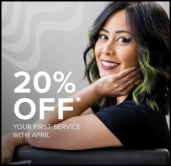 *20% off is valid for first-time guests only toward a service valued at $50 or more with artist, April. Services and products can be combined to reach your $50 minimum. Please present this download at checkout or mention when booking. Sorry, not valid with other offers or discounts. No cash value. CODE: WEB20